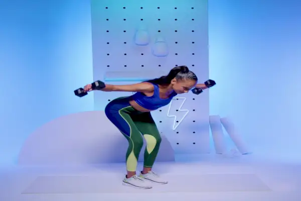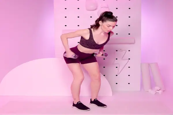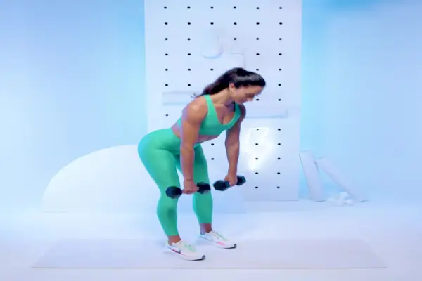 - Begynn å stå med knærne lett bøyd og kroppen hengslet fremover i 45 grader hold og en manual i hver hånd, albuene bøyd, nær brystkassen og tilbake bak kroppen.