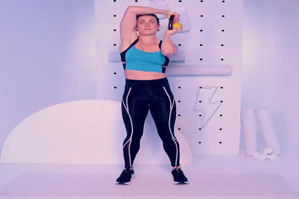 - Begynn å stå med føttene i skulderbreddes avstand, venstre arm ut til siden og sterk, høyre hånd som holder kettlebell på skulderen.