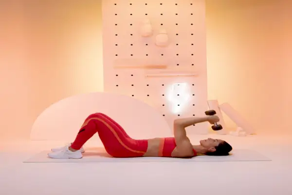 - Ligg på ryggen med bøyde knær og føttene plantet i bakken. Hold en manual i hver hånd og strekk armene rett over brystet.