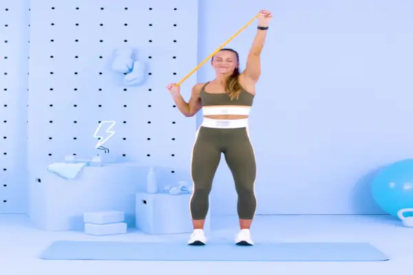 - Med et bånd rundt tomlene, stå med føttene i hoftebreddes avstand, armene over hodet, hendene i skulderbreddes avstand.