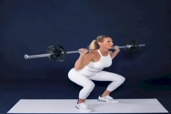 - Plant føttene godt mens du bøyer knærne, skyver hoftene bakover, klem setemusklene og gå ned i tre sekunder til en knebøy til setemusklene er litt under parallelle.