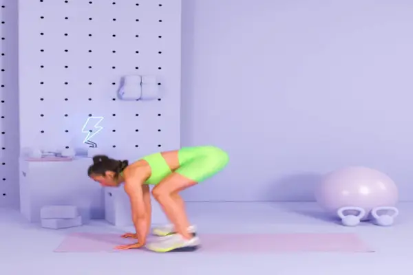 Slik gjør du: Start i en plankeposisjon med håndledd og albuer under skuldrene, stram kjernen og bena rette. Bøy knærne for å hoppe føtter fremover utenfor hendene, løft deretter brystet opp og bring hendene sammen foran kroppen, og kom inn i en lav knebøy. Snu bevegelsen for å gå tilbake til start. Det er en rep.